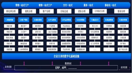 平台利用AI低代码能力,快速开发配置了多类智能应用,包括营销、销售、交付、服务等一站式门户,以及9大核心管理模块,助力全流程智能管理。