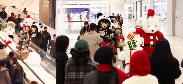 红星路同样热闹非凡,30米扶梯被装点为"雪地狂欢"主题雪道,Steiff泰迪熊们在抛雪球、堆雪人、滑雪橇的场景中错落登场,营造出灵动鲜活的冬日趣味。国际名品走廊则上演一场流光溢彩的"星光舞会"。Steiff泰迪熊家族盛装亮相,或怀抱丝绒礼盒传递惊喜,或摇响铃铛奏出节庆旋律,或以手杖勾勒甜蜜轨迹。它们伴着圆舞曲轻盈起舞,让奢华与童趣交织成冬夜的梦幻序曲,也吸引着来宾驻足合影。