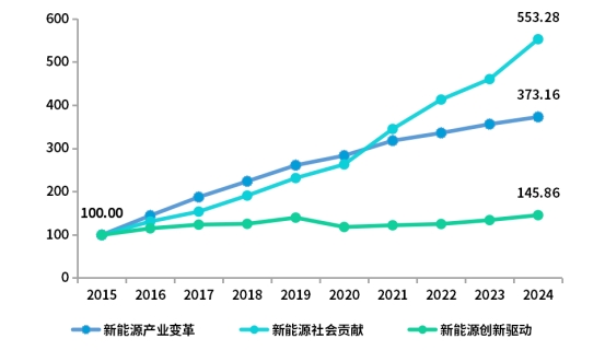 从分项指数来看,内蒙古新能源产业变革、社会贡献与创新驱动三大维度均呈现高速增长态势,2024年指数值分别达373.16点、553.28点和145.86点,风能和太阳能资源稳步开发,电力系统升级成效显著,技术攻关与模式创新潜力加速释放,内蒙古新能源产业正以强劲势头实现跨越式发展。特别是,新能源社会贡献指数同比增速高达20.05%,充分彰显新能源产业对全区绿色低碳发展的强劲支撑作用。