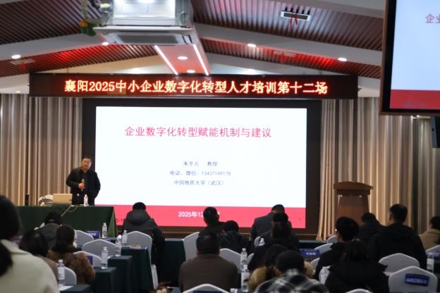 培训紧扣技术前沿,着力破解“不会转”的难题。畅捷通信息技术股份有限公司高级咨询专家胡朝阳,以《AI赋能制造业工厂数智化转型》为题,深入剖析了人工智能在生产流程优化、质量控制等场景的落地应用。下午,中国地质大学(武汉)经济管理学院朱冬元教授系统阐释了数字化转型的内生动力与赋能机制,为企业构建可持续的转型能力提供了理论框架与方法建议。