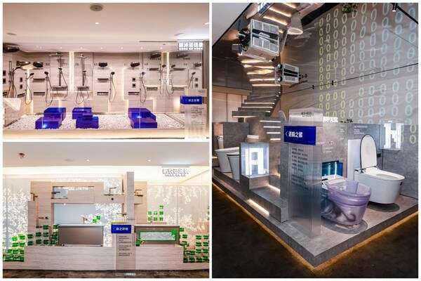 细节设计巧妙地融合自然意象与科技元素:"水之乐章"——新沐浴场景以数显智控与精准节水技术为核心,通过恒洁新款沐浴花洒的精准控水与即关即停技术,重塑日常沐浴的畅爽体验;"森之呼吸"——新悦己场景运用透光膜与绿色玻璃体块构建"热带雨林"意象,结合恒洁浴室柜的环保防潮特性与智能收纳系统,打造兼顾实用功能与美学体验的个性空间;"进阶之梯"——新智享场景通过阶梯式布局与投影"0"符号设计,配合Q、R、N系列智能马桶的静音、抗菌与极致洗护技术,重新定义健康如厕标准。这三大场景完整构建出从身体关怀到情感连接的全方位品质卫浴体系。