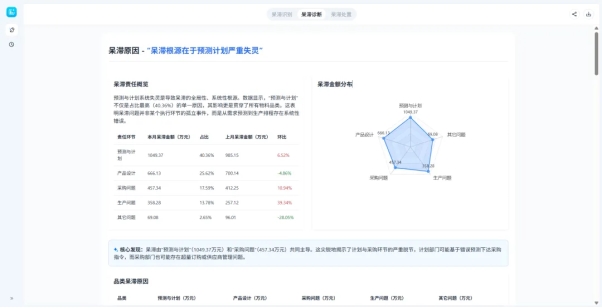 深度穿透呆滞成因,从需求预测与计划偏差、一物多码、产品设计变更、采购超量等关键维度开展溯源分析。通过可视化图表,直观呈现各原因造成的金额损失比例,帮管理人员快速锁定核心问题,为后续优化策略提供精准依据