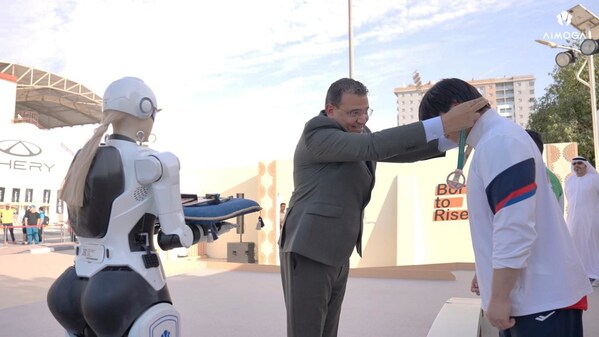 迪拜当地时间12月12日,2025亚洲青年残运会(AYPG)举行了举重项目的颁奖仪式。在这场奖牌仪式上,聚光灯不仅照亮了领奖台上的青年运动员,也照亮了两位“新上岗"的赛场伙伴:墨甲机器人墨茵(Mornine)与机器狗Argos,他们共同协助亚洲残奥委员会首席执行官为举重冠军颁发金牌,这是机器人在体育赛场的创新应用,为赛场带来一次科技感十足的颁奖仪式。