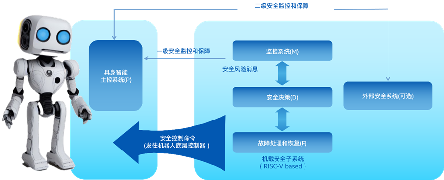此外,《白皮书》引入了PMDF安全架构,旨在系统性地管理风险,确保机器人系统在各种复杂情况下的安全运行。该架构将带有安全功能的机器人系统按功能划分为四个逻辑上相互独立的模块,分别是具身智能主控系统(P)、监控系统(M)、安全决策(D)和故障处理和恢复(F)。M、D、F三个模块组成一个安全子系统,可通过RISC-V等单独的硬件实现,既能保障高安全性,又可以直接放在机器人本体上部署。各模块之间协同合作,共同构建起坚实的安全防线。