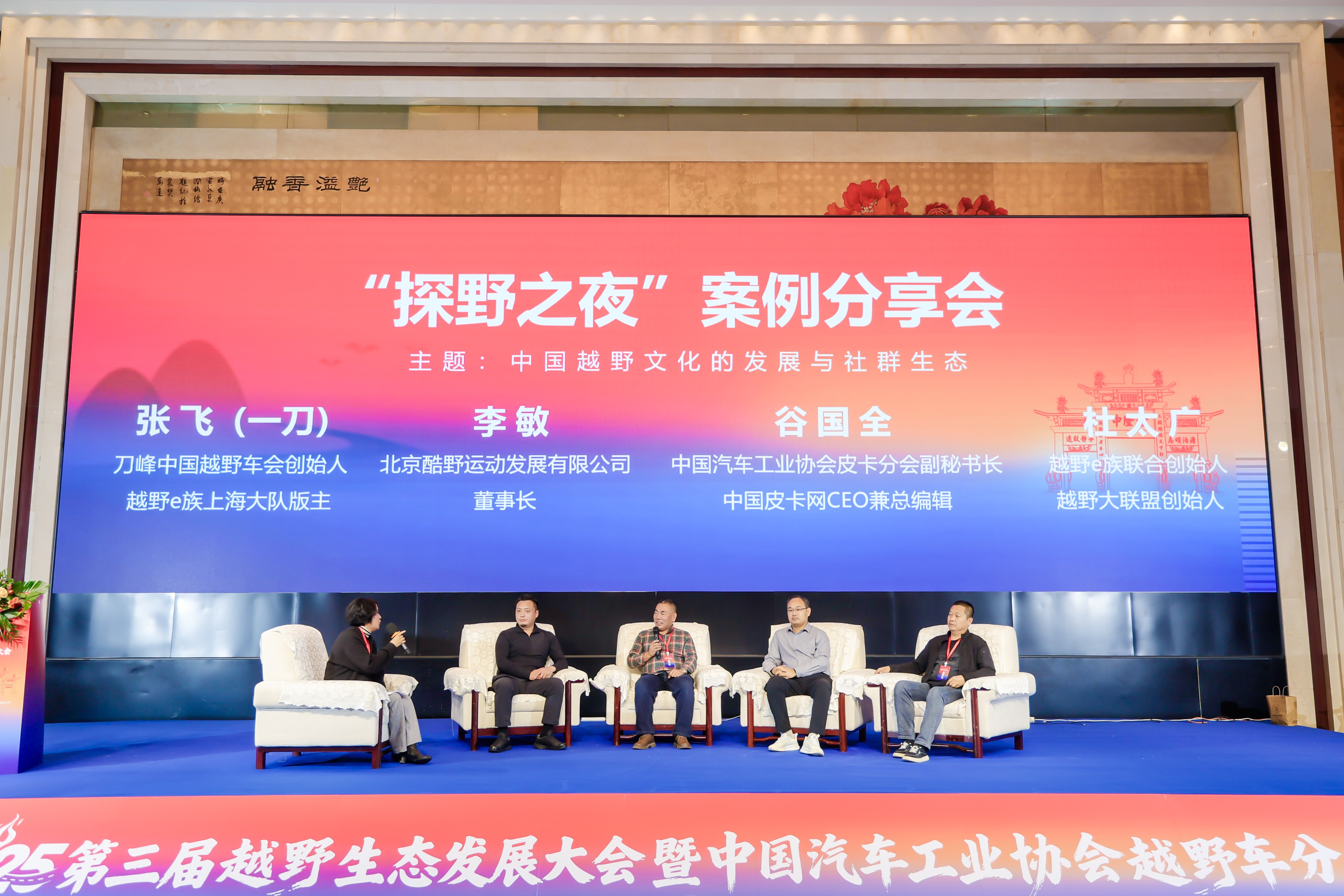 当晚举行的“探野之夜”案例分享会,将大会气氛推向另一个高潮。活动以两场精彩的圆桌论坛形式展开。第一场由襄阳达安汽车检测中心有限公司标准法规技术总监赵淑华主持,邀请刀峰中国越野车会创始人、越野E族上海大队版主张飞(一刀),北京酷野运动发展有限公司董事长李敏,中国汽车工业协会皮卡分会副秘书长、中国皮卡网CEO兼总编辑谷国全,越野e族联合创始人、越野大联盟创始人杜太广等圈层领袖,共同探讨越野俱乐部运营、赛事IP打造与用户社群培育的实战经验。