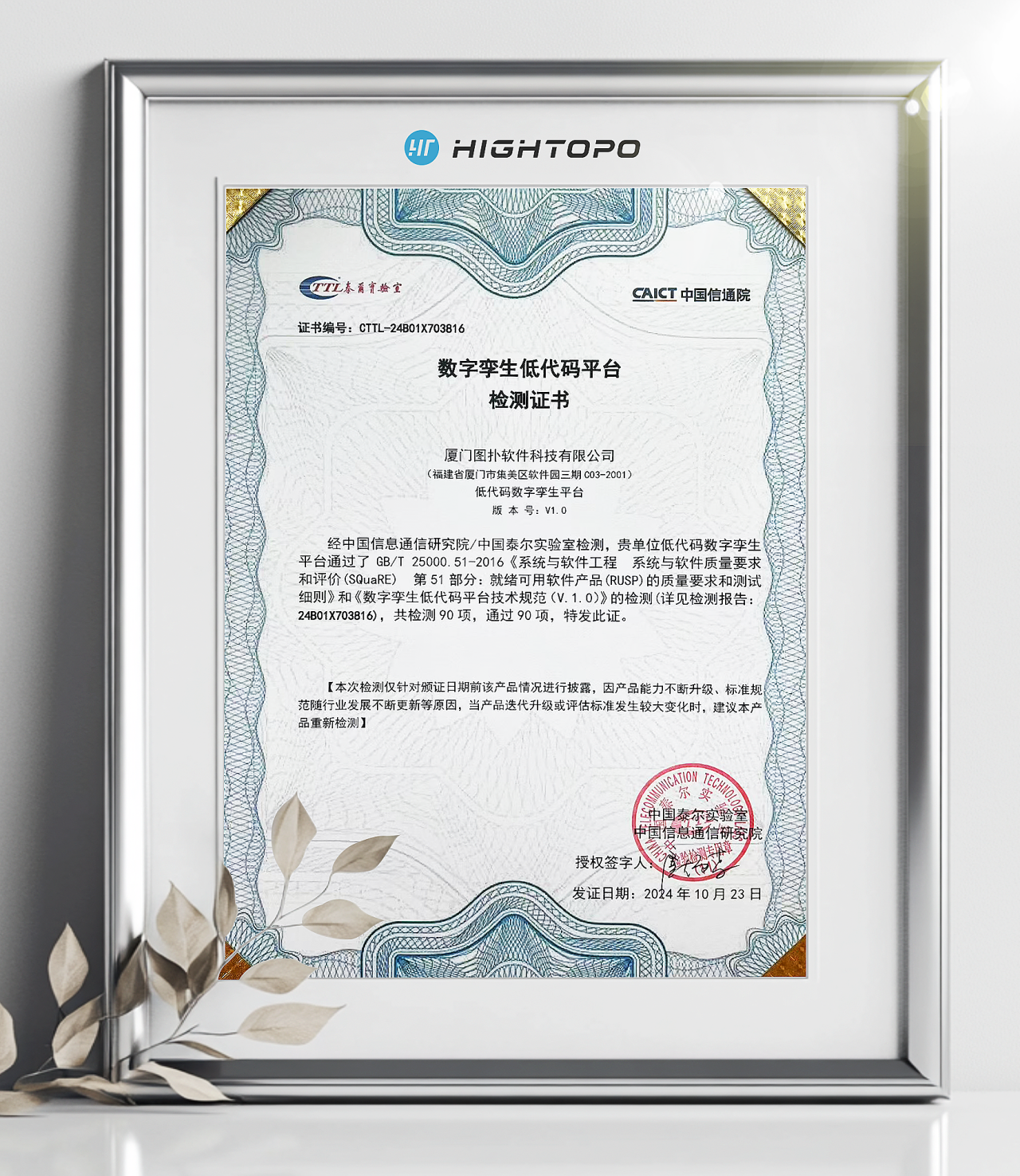 图扑软件自主研发的“数字孪生低代码平台”产品,顺利通过90项严格测评,荣获中国信通院检测认证证书。机构专家从功能完备性、易用性、平台开放度、性能优越性等维度开展技术测评,覆盖业务逻辑设计、技术发展趋势、行业应用要求、国产化适配、多协议支持、特色功能实现等多个方面。