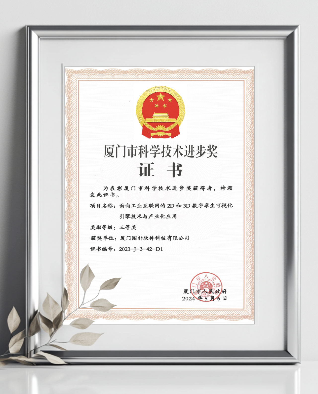 图扑软件团队以《面向工业互联网的2D和3D数字孪生可视化引擎技术与产业化应用》荣获厦门市科学技术进步奖三等奖。