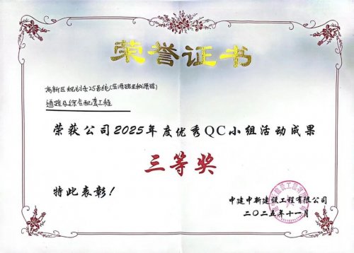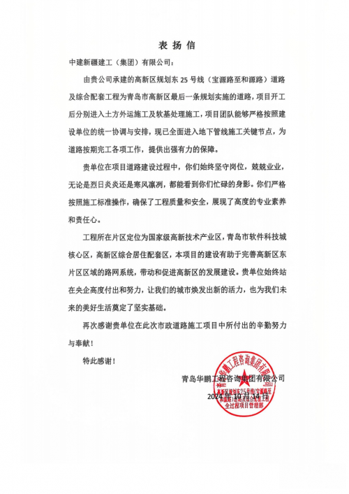 开工伊始,项目部协调各方资源迅速推进开工建设,展现“开局即冲刺、进场即决战”的攻坚姿态。为合理组织施工,项目采用“分区管控、流水施工”管理模式,将道路划分为4个工区同步推进。与地方政府、业主单位及各参建方紧密协作,精心策划施工方案,强化工序衔接,严格质量安全管控,确保了项目安全、优质、高效推进。最终项目顺利实现通车目标,跑出央企施工“加速度”,获得业主、监理单位的充分认可。施工期间获得表扬信2封,公司2024年度“优秀项目部”“工人先锋号”“青年文明号”等荣誉。