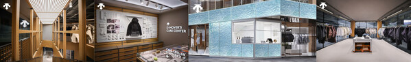 该区域集中呈现迪桑特ALLTERRAIN系列产品。陈列系统采用可移动、可拆解、可组合的模块化设计,打破传统货架的固定边界,使服装以更开放的方式被观看与理解,也为消费者提供更具探索感的浏览路径。空间内同步设置D-Mover'sCareCenter,为行动家提供专业洗护与维修等服务。通过将护理服务纳入同一空间体系,迪桑特进一步延展其专业支持能力,使品牌关注点从装备本身延展至产品在整个使用周期中的表现与维护,品牌角色由此从"装备提供者"深化为"运动生活方式支持者"。同时,在这个空间中品牌也为来访者呈现了第一个迪桑特品牌咖啡空间–"DESCENTECafé",旨在为消费者在未来之城的空间中带来更多的增值体验。
