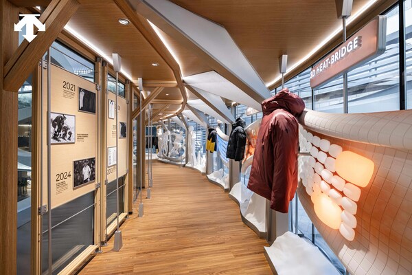 连接"专精之域"与下一主题空间的连廊,集中了品牌多年来的技术积累。中部设置莫比乌斯环装置,其上呈现滑雪、铁人三项、高尔夫与跑步等多项运动形象,直观展示品牌在三大专业运动及多场景训练领域的体系化布局。连廊一侧展示HEATNAVI®、3D保温系统、SCHEMATECH等核心服装科技,另一侧则呈现品牌发展过程中的重要里程碑节点。通过材料、结构与图文信息的组合呈现,品牌多年在功能创新与产品研发层面的积累得以清晰展示。