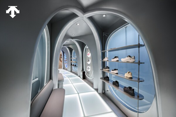 连接高尔夫与儿童区域的连廊空间,以流畅连续的造型语言串联不同运动场景。空间以连续弧形结构勾勒出清晰的前行动线,墙面与展示单元在行进过程中形成明确的方向引导,增强整体行走节奏与体验连贯性。连廊内以半封闭展示形式呈现鞋履产品,并结合具有未来感的舱体造型设计,使展示界面在满足功能性的同时,强化空间的整体视觉特征。