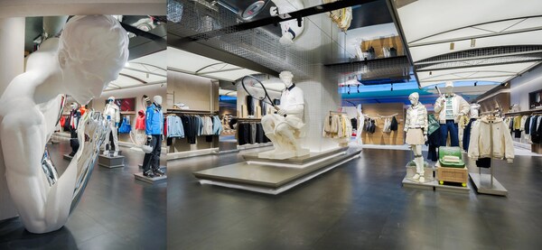 步入门店,以“意动永恒"为主题的专业运动区率先进入视野。这一区域以竞技力量元素与科技感的碰撞打造体验空间:入口的滑雪运动专区为空间注入米兰冰雪赛场的速度与激情;后场来到网球与高尔夫专区,与身披FILA经典网球单品BB1大满贯POLO的雕塑《网球新章》其一再次相遇,感受古典艺术的现代张力,并探索品牌在网球领域的传承与拓新。