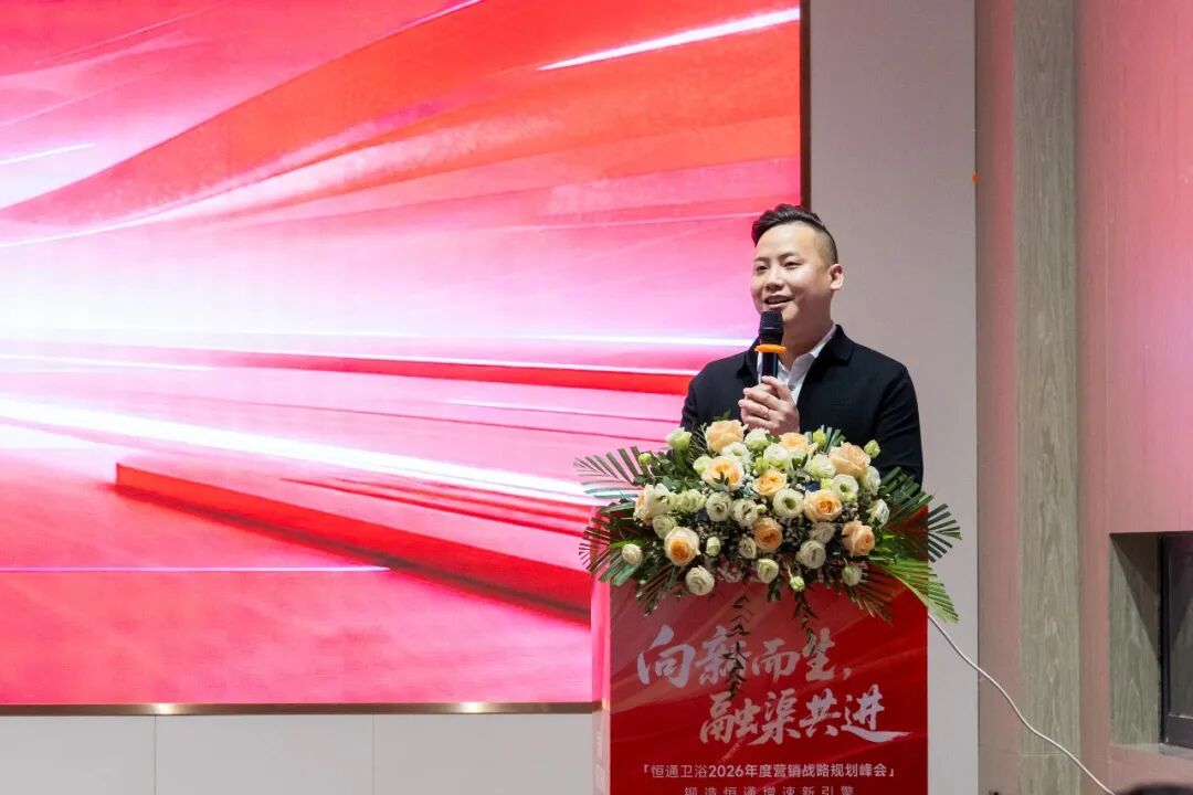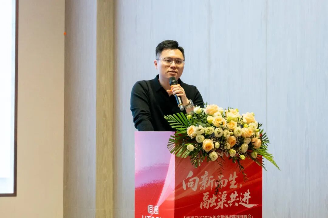 紧接着,副总经理颜建炜对恒通卫浴2026年全新产品体系进行了详细发布与卖点深度讲解,展现了公司强大的研发实力与以用户为中心的产品理念,现场反响积极,将会议气氛推向高潮。