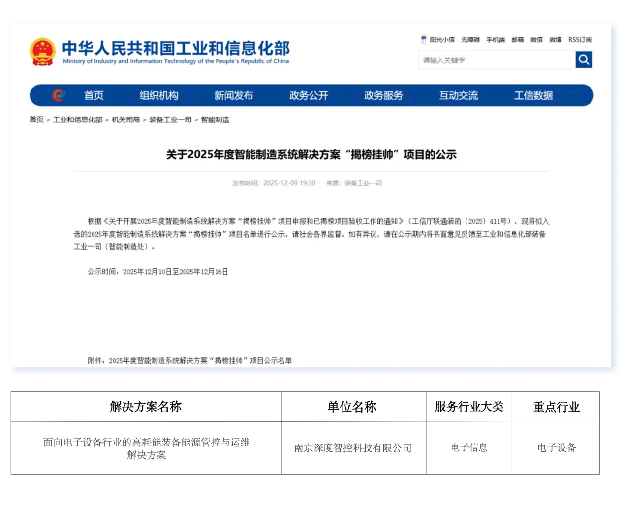 近日,工业和信息化部公示了2025年度智能制造系统解决方案“揭榜挂帅”项目名单。深度智控以“面向电子设备行业的高耗能装备能源管控与运维解决方案”成功揭榜,成为能效智控领域唯一入选产品。