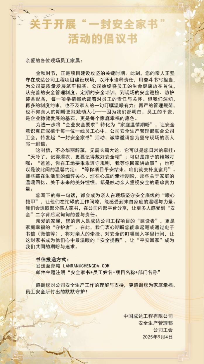 时值年底,中国化学工程成达公司各工程项目进入攻坚冲刺的关键时期,一线员工坚守建设现场,全力向年度目标发起冲刺。为推动“企业安全要求”转化为“家庭温情期盼”,让安全意识扎根一线员工心底,公司在安全生产“雷霆行动”期间发起“一封安全家书”活动。活动共征集11封饱含深情的家书,字里行间满是家人的牵挂与叮嘱,既为项目安全生产注入浓浓家庭温情,更在员工心中筑起坚实的安全防线。