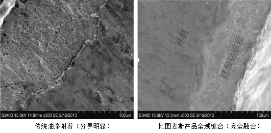 比图麦斯的技术团队打破了行业惯例,研发出一种独特的纳米“生长式”涂料。不同于传统涂料的物理粘附,该技术利用纳米级水性无机母液与微米级锌铝合金粉的精准配比,在铁基材表面诱发化学反应,原位“生长”出致密的硅酸铝铁无机互穿网络聚合物层。这种全域化学键合实现了涂层与基材的原子级融合,从根本上解决了结合力不足的问题。