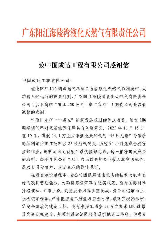 此次项目”一次试运、一次成功”,充分彰显了成达公司在LNG接收站工程领域的核心技术优势、精益化项目管理能力与全链条服务水平,为行业同类项目建设运营树立了可复制、可推广的实践经验。公司将持续深耕清洁能源工程领域,以更优技术方案、更严质量标准、更实工作作风,不断推动天然气储运工程领域技术精进,为我国能源结构转型与“双碳”目标实现作出新的更大贡献。(中国化学工程成达公司党群工作部朱国卿)