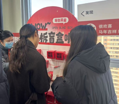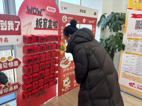 完成学习后,客户前往抽奖区参与“盲盒墙”抽奖,奖品包括洗衣液、养生锤、雨伞、陶瓷碗、保温杯、春联等实用年节好物,既体现节日关怀,也激励客户主动参与知识学习,实现“寓教于乐”的传播目标。