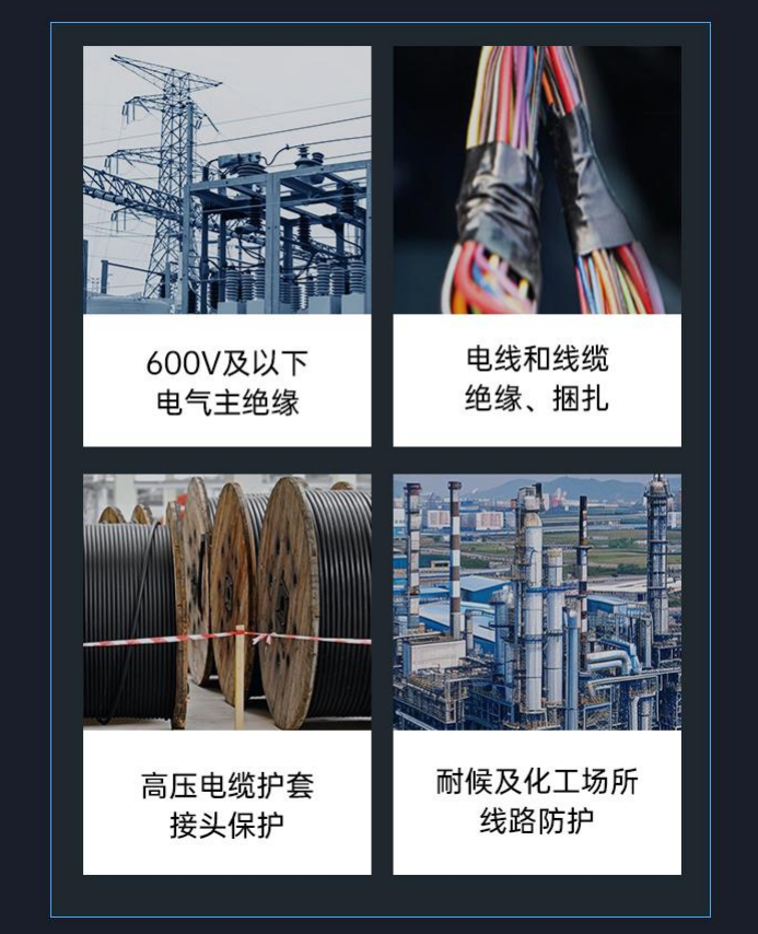 优异的绝缘防护离不开紧密贴合的包裹。J93全天候电气胶带具备良好的拉伸回弹性是普通胶带1.5倍;良好的从形性,可均匀拉伸并紧密包裹在不同形状、尺寸的电缆接头、母线或线束上,自动回弹产生持续紧绷力,消除气泡与褶皱。这不仅提供出色的机械保护与防潮密封性,也使施工更加便捷、外观更为整齐。配合“半重叠绕包”等规范施工方法,可构建无缝隙的绝缘保护层。