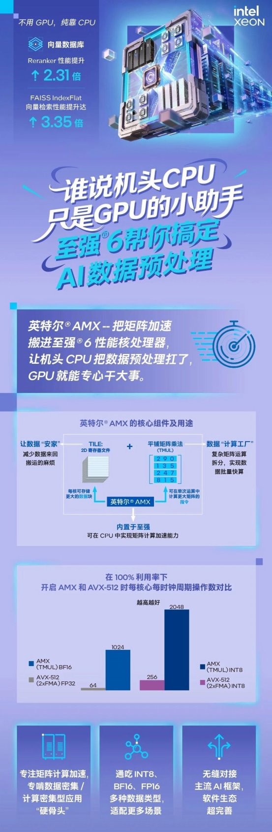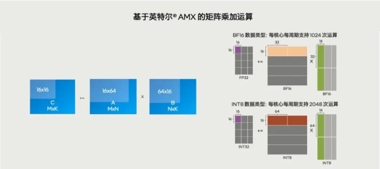 要是第四代之前的至强CPU,这种高度依赖矩阵计算能力的“杂活”它还真不太容易扛,但自从2023年开始内置了AMX(高级矩阵扩展)技术后,它还真就从从容容,游刃有余了!有人曾戏称AMX是“CPU里的TensorCore”,就是因为它天生就是为矩阵运算加速而设计的。