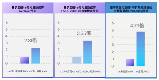 一直被当成“GPU小跟班”的机头CPU,早不是“GPU忙死我旁观、算力大活我不担“的角色了,尤其是至强处理器开启AMX技术的支持后——英特尔近期就在多个与客户及合作伙伴沟通的场合中披露了向量数据库上的多个测试数据,如:在至强®6性能核处理器上,开启AMX进行加速后,FAISSIndexFlat向量检索性能提升达3.35倍,Reranker性能也会拉到未启用时的2.31倍。还有一组基于第五代至强可扩展处理器平台的测试数据:在激活AMX加速后,其上的向量数据库的Embedding性能也可拉到未开启时的4.79倍。所有这些基于实战的数据都指向一点:至强CPU能帮GPU分担向量数据库的工作。