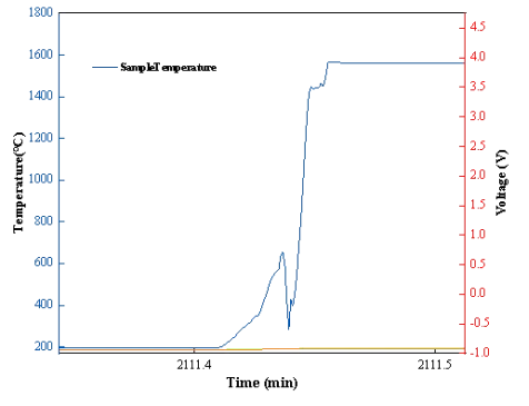 对图2温度数据及图3产气速率、产气量数据进行分析后发现,该电池热失控十分剧烈,并且放大样品温度曲线可以发现,整个热失控过程从开始到结束持续不到3s,就完成了1300℃以上的温升,温升速率达到了200000℃/min以上。同时,观察气体数据可以发现,在热失控过程中最大产气速率达到15000L/min以上,展现了锂电池燃爆时极强的冲击力。