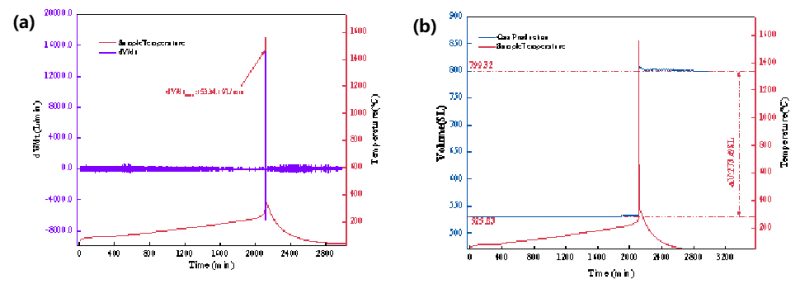 图3三元九系电池热失控(a)产气速率曲线及(b)产气量曲线