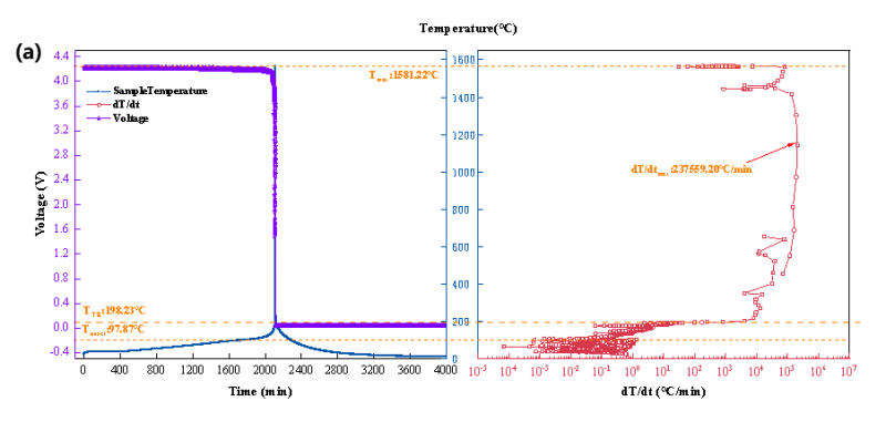 图2三元九系电池热失控(a)温度&电压-时间曲线、温升速率-温度曲线和(b)附加热电偶温度-时间曲线