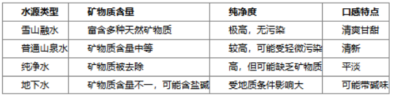 口感方面,这类水被形容为“温顺清爽”、“有点甜”。相比普通饮用水,它含有更多对人体有益的微量元素,如钙、镁、锶、钾、偏硅酸等。