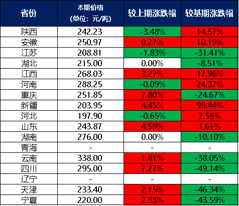 分价格区间来看,本期两碱工业盐单价在300元/吨及以上的地区有1个,为云南;两碱工业盐单价在300元/吨以下的地区有14个,分别是陕西、安徽、江苏、湖北、江西、河南、重庆、新疆、河北、山东、湖南、四川、天津、宁夏。