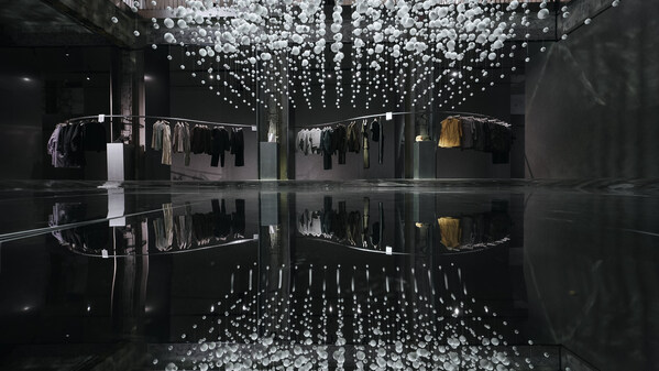 为此而生的「K:PARTICLE」自然叙事空间,正是这一理念的立体呈现。微观之物的能量在此具象化,被重塑为一种更有实感的叙事表达。空间首先通过三组独特的艺术化互动装置,将抽象的「粒子」概念解构为可视、可触、可感的动态前沿艺术。在这里,服装超越了本身的物质形态,与整个空间的光影、气流与能量场同频共振,引领到访者步入一个由微观美学重构的、充满生命律动的感官新世界。