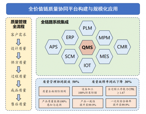 第四,全价值链质量协同平台的规模化应用。平台以质量管理系统为核心,无缝连接企业内部研发、生产、供应链及售后服务等环节,并延伸至上下游合作伙伴,实现质量信息的实时共享与业务的协同优化。据内部数据显示,该平台的应用使质量管理协同提效50%,质量故障率同比下降30%,产品一致性提升至99.9%。