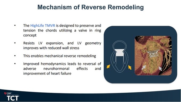 此外,根据2024TCTWolfgangRottbauer教授和ThomosE.Waggoner教授的报告,HighLifeTSMVR器械被证明有较好的“缩环效应",左室逆重构效果显著。由于其不依赖径向力支撑的锚定方式。同时血流动力学的改善可以降低心衰的发生,助力左心室逆重构,降低心衰风险,展现出独特的临床优势。