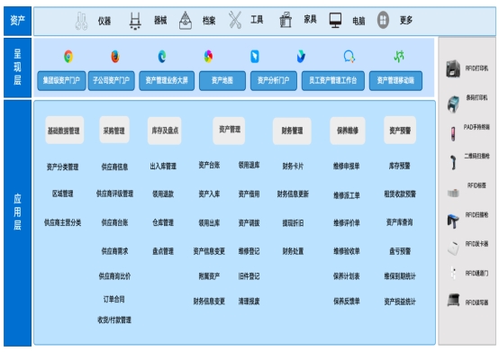 平台支持与物联网硬件设备联动,包括感知设备、数据采集设备与输出设备等,如RFID读写器、二维码扫描枪、RFID打印机、条码打印机,为资产智能识别、定位、溯源提供硬件支撑。