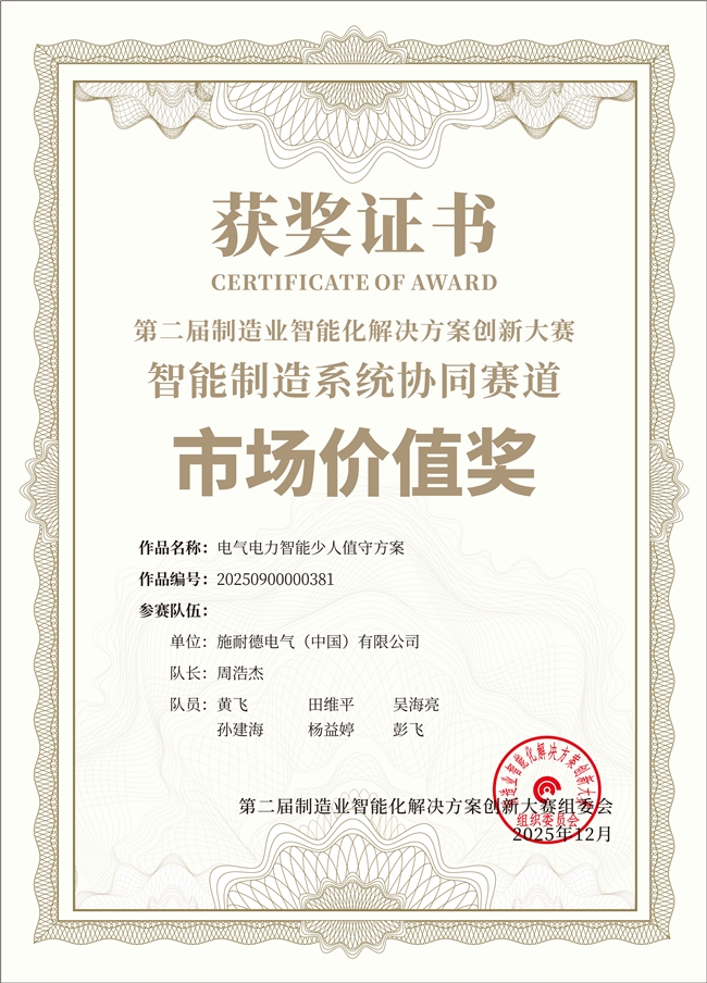 施耐德电气荣获2025制造业智能化解决方案创新大赛“市场价值奖”