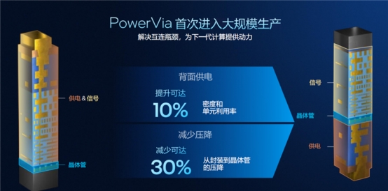 这一做法为晶圆正面节约了10%的空间,一定程度上提升了晶体管密度。