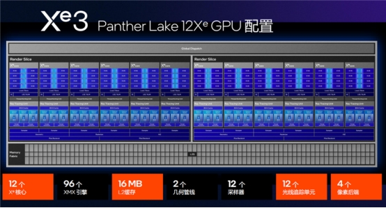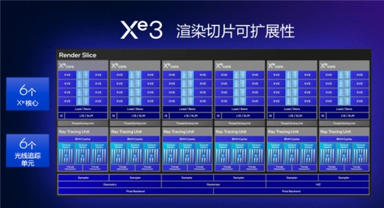 Xe3架构用的是可伸缩扩展的渲染切片设计,12XeGPU的每个切片包含6个Xe3核心,6个光追单元,以及6个采样器、几何单元、光栅单元、HiZ单元(层次Z)、两个像素后端等模块。。