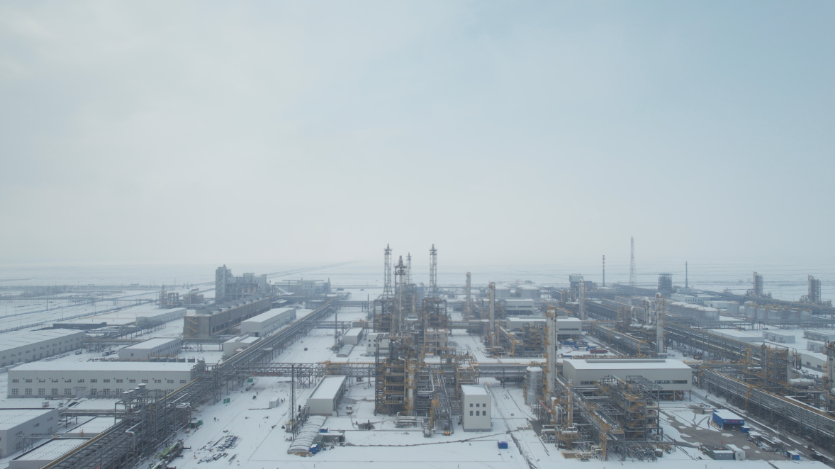 曾经荒芜的戈壁滩,一座秩序井然的现代化厂区已然矗立:装置林立挺拔,管廊纵横交错,勾勒出清晰的工业脉络。冬日降雪覆盖厂区,天地间铺展成一片银白,设备与构架在雪光与灯光的交相映照下更显规整冷峻。施工现场,焊花在雪地中频频绽放,与远处绵延的灯影连成一片,建设者们的身影在光影交错间穿梭忙碌,为冰冷的钢铁设施注入奋进温度。
