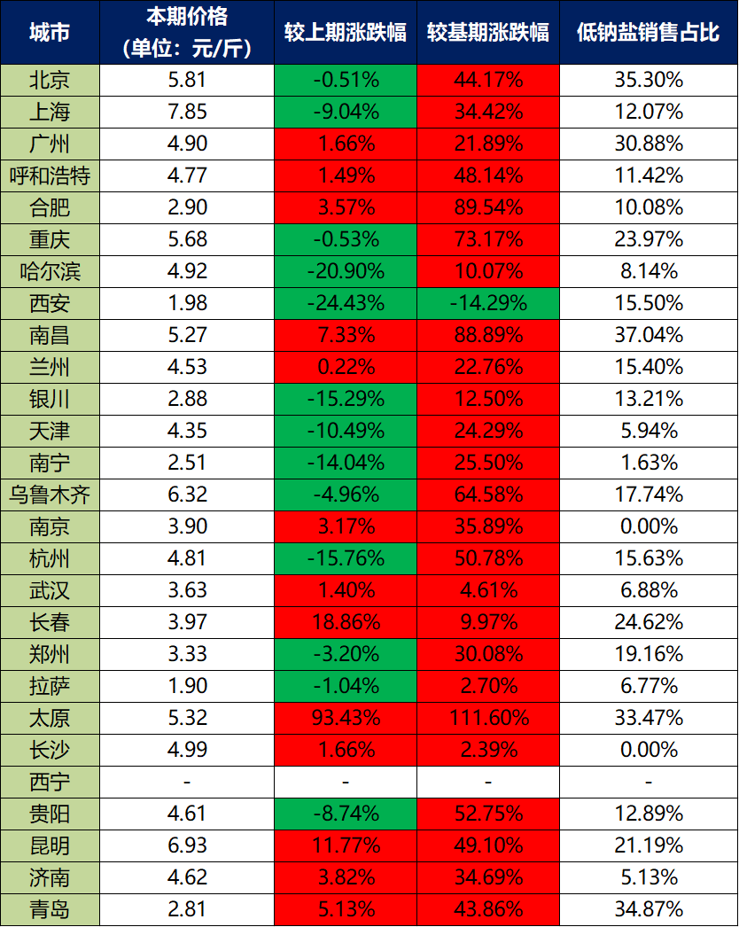 分价格区间来看,本期超市食用盐销售单价在5元/斤以上的城市有7个,分别是北京、上海、重庆、南昌、乌鲁木齐、太原、昆明;超市食用盐销售单价在4-5元/斤之间的城市有9个,分别是广州、呼和浩特、哈尔滨、兰州、天津、杭州、长沙、贵阳、济南;超市食用盐销售单价在3-4元/斤之间的城市有4个,分别是南京、武汉、长春、郑州;超市食用盐销售单价在3元/斤以下的城市有6个,分别是合肥、西安、银川、南宁、拉萨、青岛。