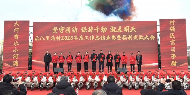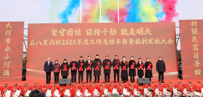 2月10日,邹城市后八里沟村2025年度工作总结表彰暨福利发放大会盛大启幕,大会以“坚守团结・保持干劲・就是明天”为核心主题,后八里沟村全体村民、鑫琦集团全体员工欢聚一堂,共同回望2025年攻坚克难的奋斗征程,表彰先进典型,擘画新年发展蓝图,现场暖意融融、气氛热烈,满溢着奋进与团圆的浓厚氛围。