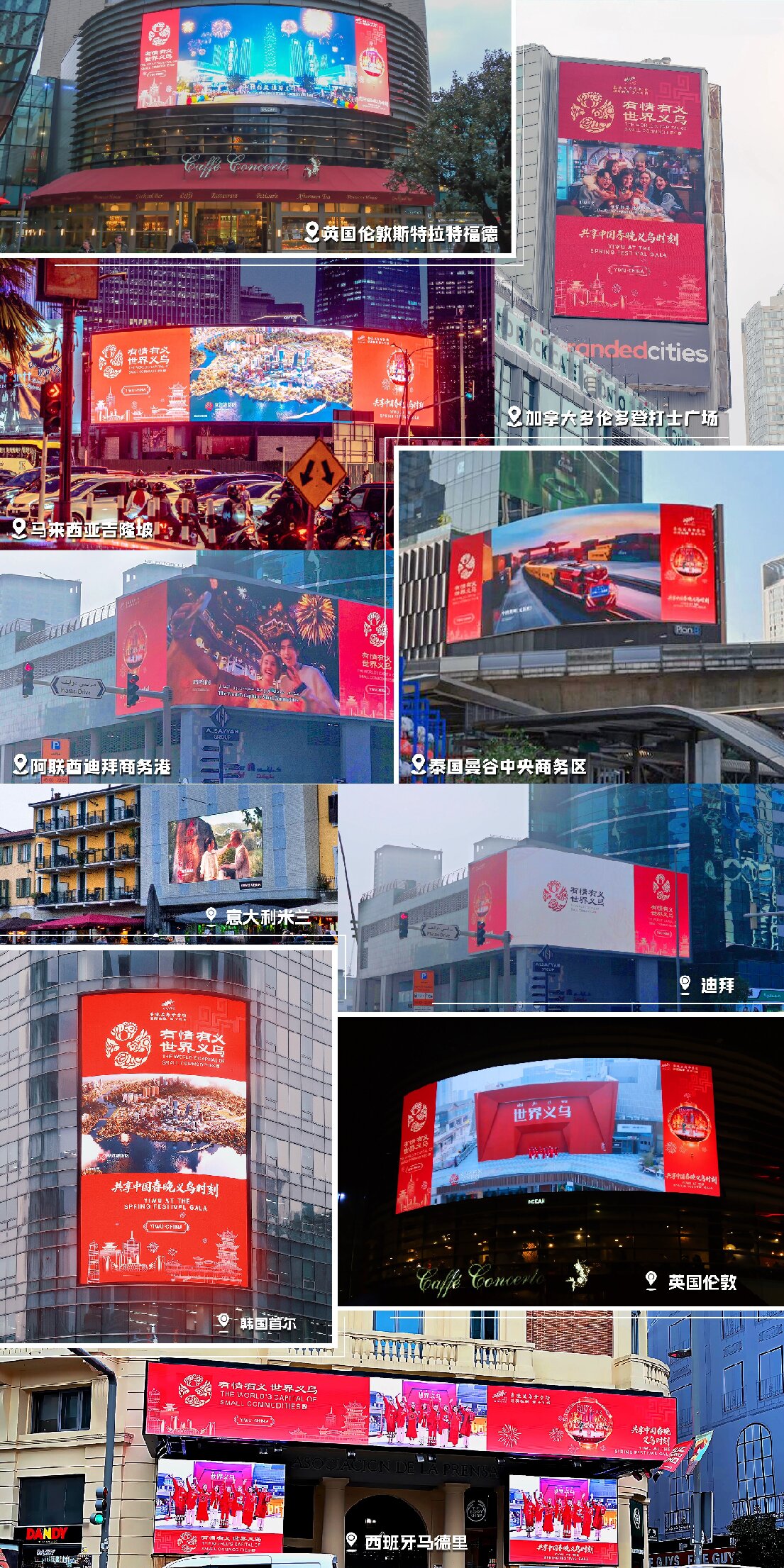 美国纽约时代广场、加拿大多伦多登打士广场、阿联酋迪拜CBDBay、法国巴黎歌剧院大街、意大利米兰纳维利、英国伦敦斯特拉特福德市、韩国首尔明洞乙支路、马来西亚吉隆坡燕美路等20个国家和地区 核心商圈的户外大屏,同步滚动播放义乌城市形象宣传片及央视2026年春晚义乌分会场邀约海报 。