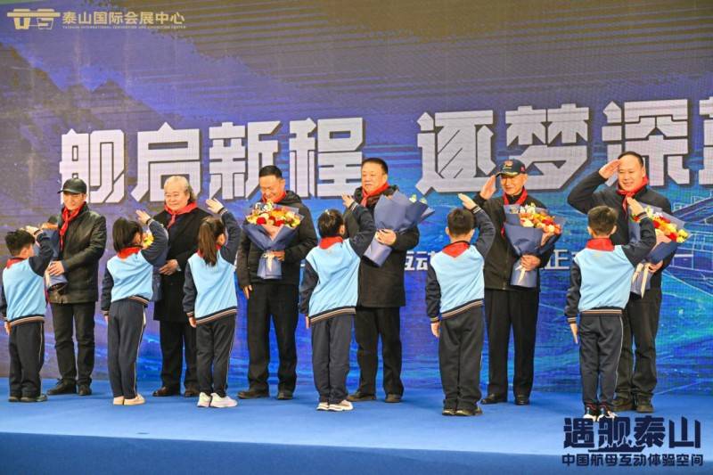 开幕式上,环形屏幕循环播放航母主题宣传片,震撼呈现大国重器风采。山东省群文书画院院长李思峰、刘传红先后致辞,一致认为“遇舰泰山”既是普及国防知识、弘扬爱国精神的重要阵地,也是挖掘泰山文化、彰显泰安特色的重要载体,希望项目持续发挥桥梁作用,助力泰安文旅融合与研学旅行高质量发展。青少年代表向嘉宾献花,传递新时代青少年的国防情怀与爱国初心。