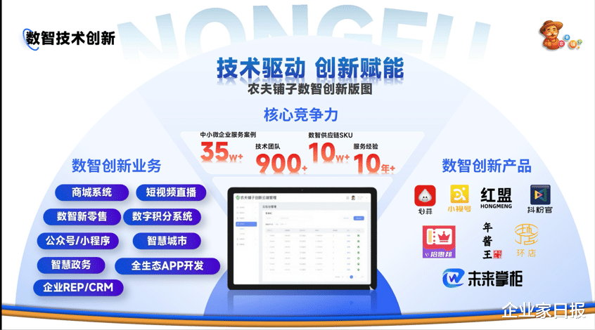 农夫铺子摒弃“技术堆砌”思维,聚焦中小微企业“缺技术、成本高、转型难”的核心痛点,打造“用得起、玩得转、见效快”的数智解决方案。自主研发未来掌柜智慧屏、AI收银系统等智能硬件,以及腾翼云、交易兔等数智服务平台,从底层技术上降低中小企业数字化转型门槛与成本。其中未来掌柜智慧屏已完成全国样板市场筹备,计划先实现五万块落地,最终突破百万台部署目标,构建生态式数字广告网络。
