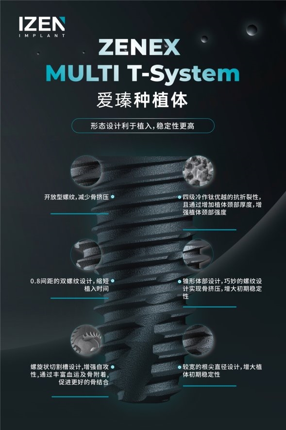 材料与结构设计的创新,则进一步强化了爱瑧种植体的临床适配性。其选用抗拉强度高达750+MPa且生物相容性好的四级冷作钛材质,大幅降低了植体折裂风险。形态上,ZENEXMULTIT-System采用“锥形主体+柱形颈部”结构,配合开放式螺纹与螺旋状切割槽设计,为即刻种植、即刻负重等高难度临床场景提供可靠支撑。