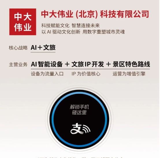 在“十五五”规划的开局之年,中大伟业(北京)科技有限公司与支付宝达成合作,深度融合“碰一碰”近场交互与AI智能设备,以“感知—理解—执行”的完整闭环,重新定义文旅服务的每一个触点。这不仅是一次技术联姻,更是对国家“人工智能+”战略的躬身入局,是对文化和科技深度融合时代命题的坚定回答。