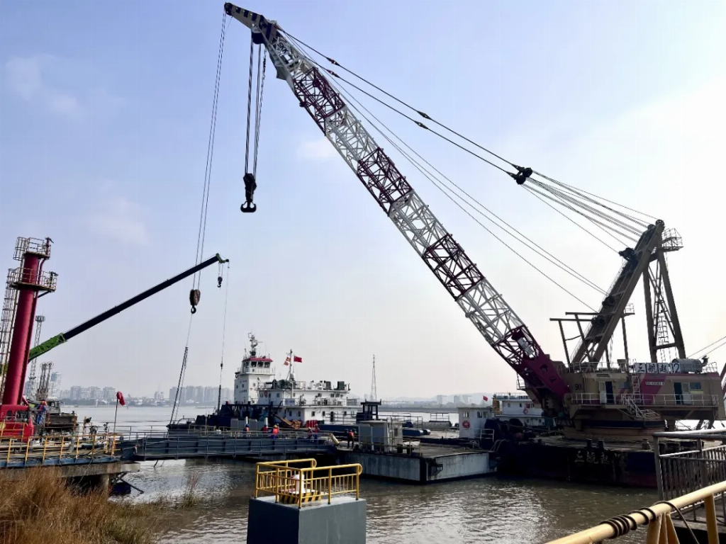 该项目位于甬江北侧岸段、清水浦大桥下游,主要施工内容包括原有结构拆除、新建三座撑杆墩与两座系缆墩,以及钢引桥制作与安装。
