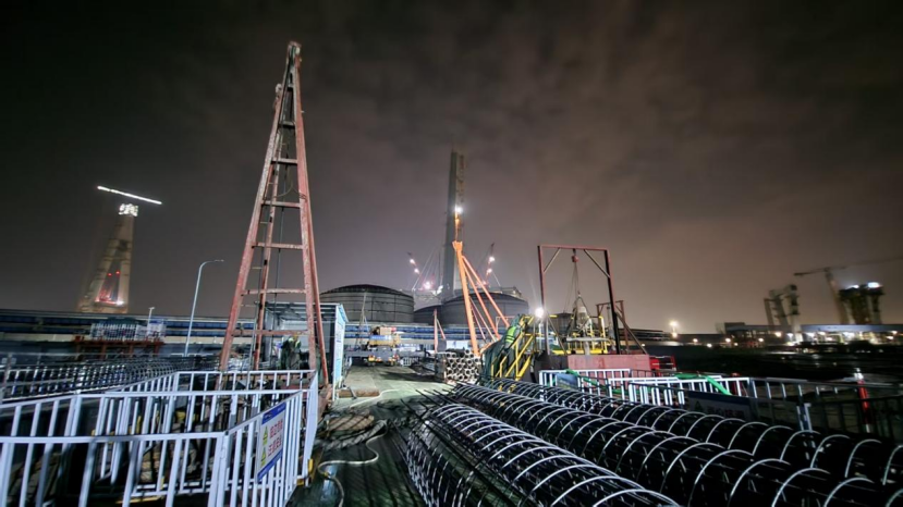 该项目引桥工程灌注桩施工区域地处镇海港区液体化工作业区内,场地空间极其狭小,不到2000平方的钢平台,大型施工设备的摆放、调度和作业空间严重不足,钻机、起重机等大型机械无法高效展开作业。加之施工场地条件不断动态变化,地质环境复杂,进一步增加了施工难度。灌注桩施工工序复杂,单根桩施工流程涵盖桩位放样、钻孔成孔、清孔、钢筋笼吊装、混凝土浇筑等多个环节,受场地和设备数量限制,一套钢筋笼吊装需耗时4个多小时,清孔后单根灌注桩平均施工时长超过10小时。为破解空间困境,项目技术团队反复勘察现场,不断调整施工计划和桩位顺序,根据场地实际灵活排布施工点位,确保每一寸空间都得到高效利用,每一道工序都能有序衔接,最大限度降低场地受限带来的影响。