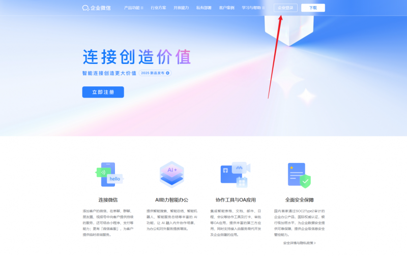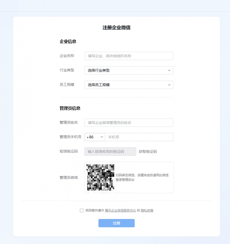 前往企业微信官网,使用有企业管理员权限的账号登录。如您尚未在企业微信中拥有企业,可以参考创建&注册企业来创建一个新企业。