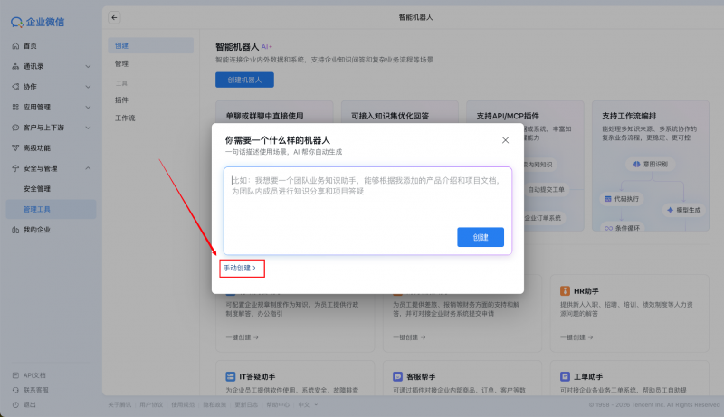 在企业微信管理后台左侧导航依次找到并进入安全与管理 > 管理工具 ,选择智能机器人 ,然后在页面内点击创建机器人 。