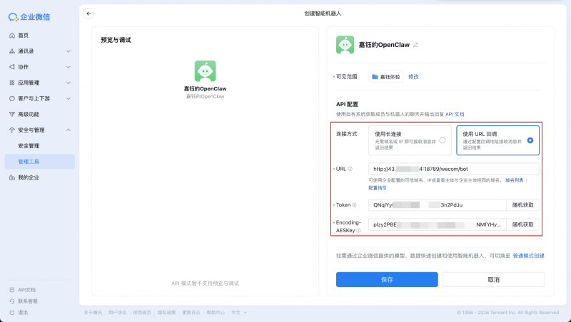将复制好的公网IP地址(一串类似12.12.12.12的数字),替换到下面的URL链接中,然后填入到企业微信管理页面的URL输入框中。